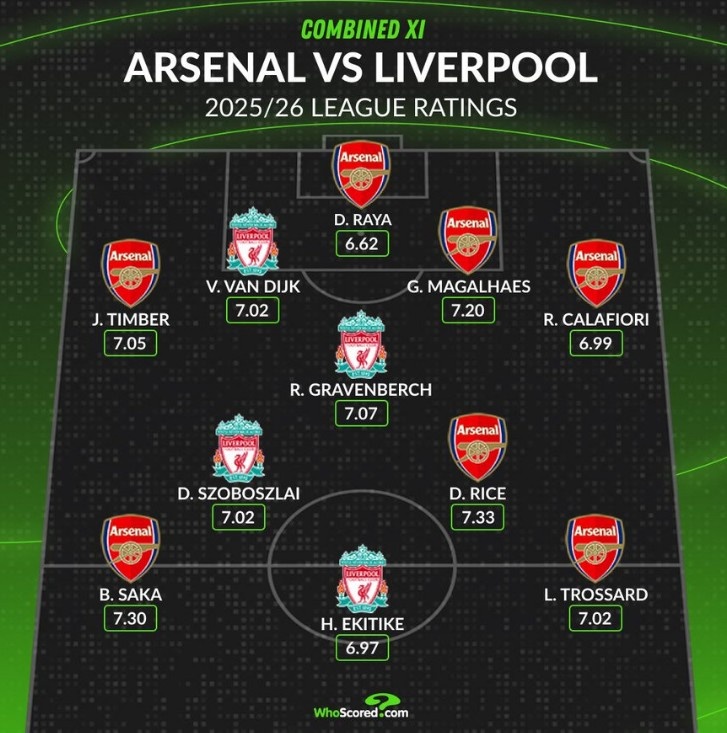 苏超冠军 利物浦vs阿森纳本赛季评分最高阵:赖斯领衔枪手7人,索博在列