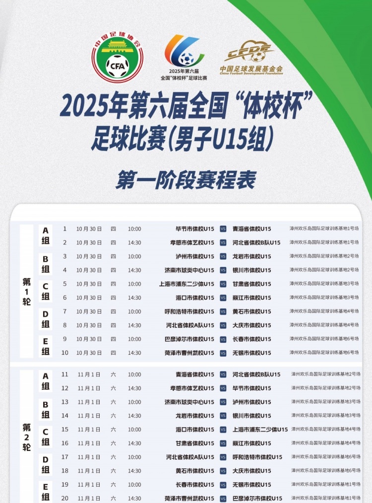 第六届全国“体校杯”古代足球 赛事 (男子U15组)第一阶段分组+赛程表