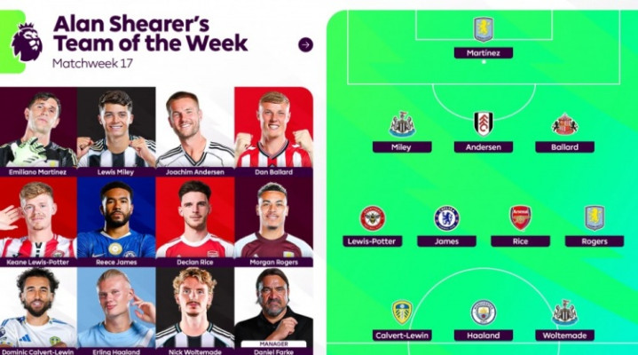 直播吧12月23日讯英超第17轮战罢,阿兰·希勒评本轮最佳阵,欧洲杯直播吧哈兰德、赖斯、里斯·詹姆斯、摩根·罗杰斯在列。
