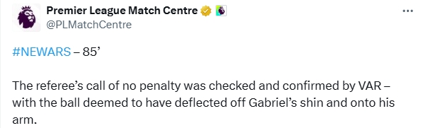 英超官方:球经加布里埃尔小腿反弹到手上,VAR确认不是十二码球