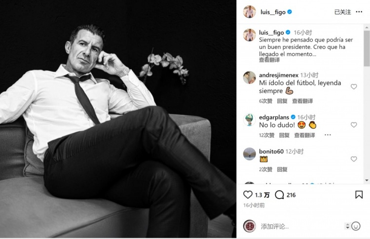 菲戈社媒晒出自己身穿正装的照片,配文:“我一直认为自己能够成为一个好主席,我觉得时机已经到了。”