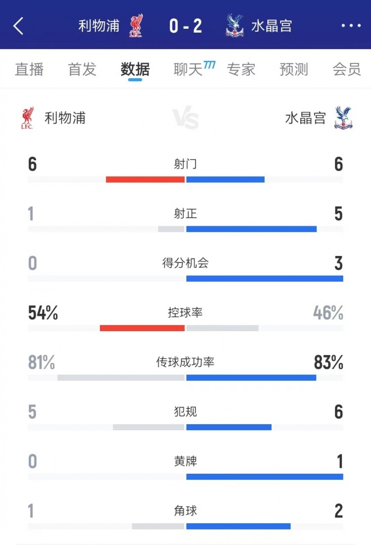 利物浦vs水晶宫半场数据:射球 6-6、射正1-5、积分 机会0-3