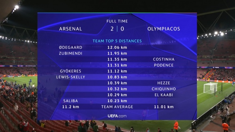 本场赛事 阿森纳球员移动距离 最长情况如下: