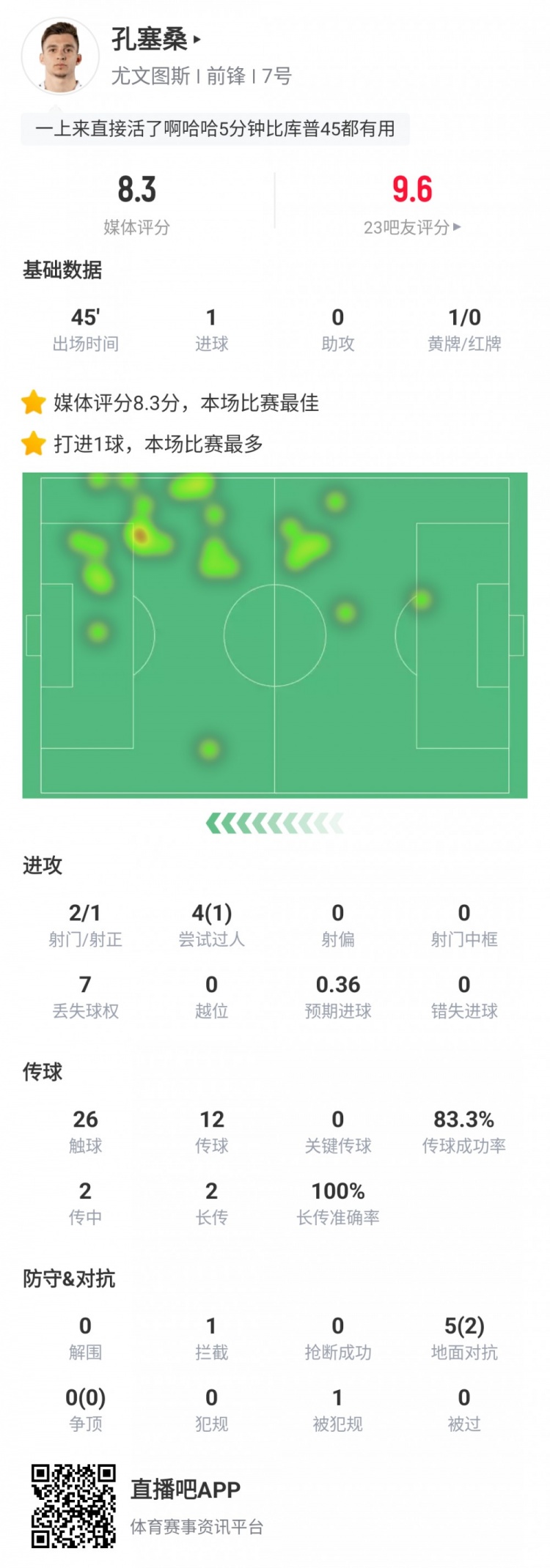 小孔塞桑本场数据:下半场后备 出场打进1球,评分高达8.3分