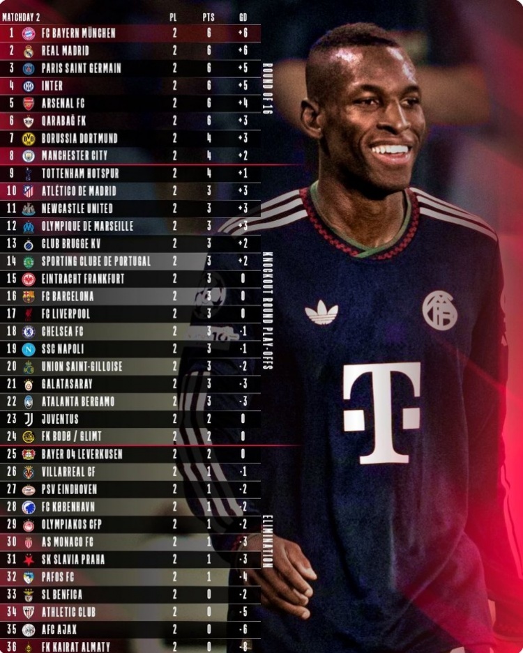 拜仁官推晒两轮过后欧冠积分榜:拜仁以得分 优势领跑,皇马次席